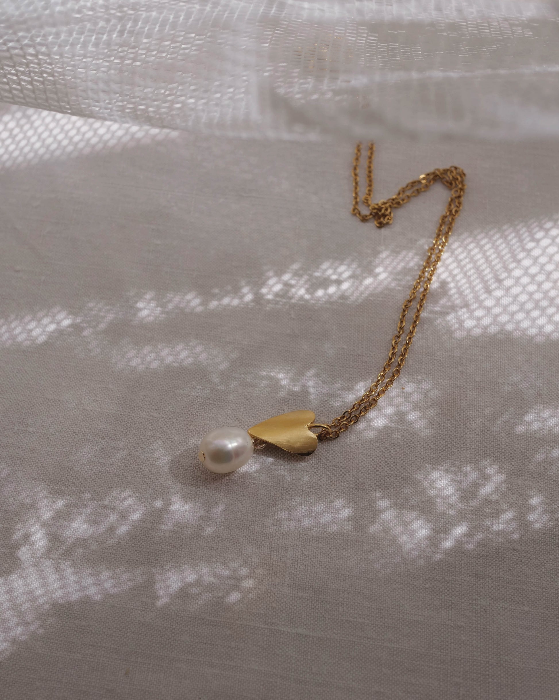 Un pendentif coeur dessiné, découpé et mis en forme à la main pour un bijou unique. Rehaussé d'une perle d'eau douce.